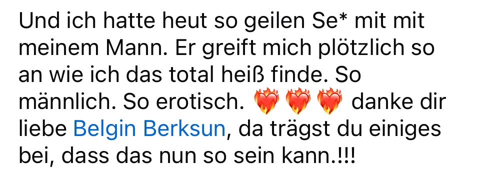 Anja, 40 Jahre alt: Sie hat immer wieder hinterfragt, ob ihre Beziehung richtig ist, weil sie keine Verbindung zu ihrem Mann fühlen konnte. Sie fühlte sich von ihm nicht gesehen und dachte, er bräuchte auch ein Coaching, weil sie sich weiterentwickelt hat und er nicht. Die Streitigkeiten zwischen ihren Kindern und Mann stressten sie so sehr und weil sie ständig als Schiedsrichterin einsprang. Seit unserem Coaching hat sich ihre Beziehung völlig verändert und sie fühlt sich als Frau von ihrem Mann gesehen. Sie spürt die Liebe und Verbindung zu ihm und hat aufgehört, ihre Beziehung anzuzweifeln. Anja hat erkannt, was sie für einen tollen Mann an ihrer Seite hat. Nach 19 Jahren Partnerschaft und Ehe erlebt sie mit ihm eine leidenschaftliche Sexualität und fühlt so weiblich und begehrt, wie noch nie.